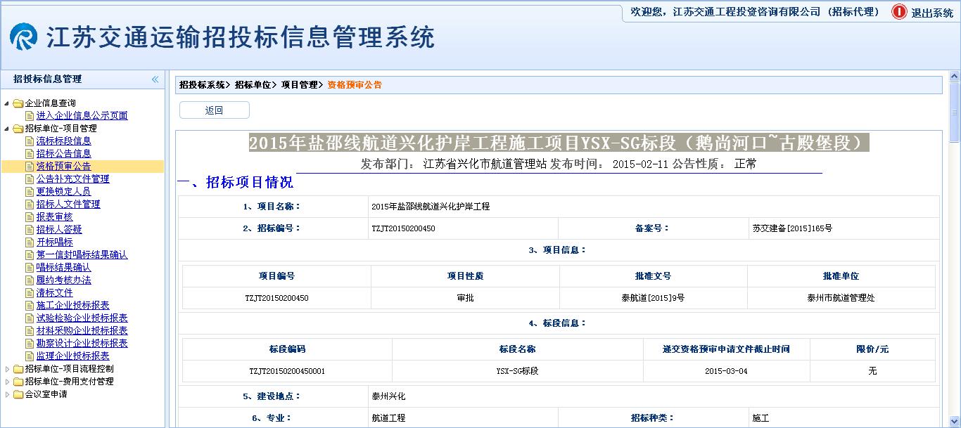2015年鹽邵線航道興化護(hù)岸工程施工項(xiàng)目YSX-SG標(biāo)段(鵝尚河口~古殿堡段)資審公告