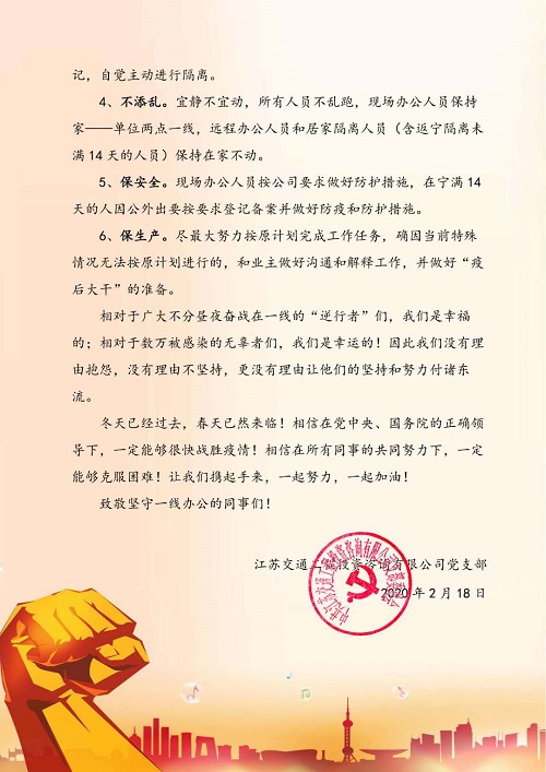 公司制定了詳細(xì)的員工復(fù)工制度及疫情防控預(yù)案。公司的黨支部針對(duì)此次疫情發(fā)文,號(hào)召全體員工做到:講政治、顧大局、講誠信、不添亂、保安全、保生產(chǎn);在此特殊時(shí)期做好防控措施,保障個(gè)人及家人的安全前提下盡最大努力按照原計(jì)劃完成工作任務(wù),并做好“疫后大干”的準(zhǔn)備。